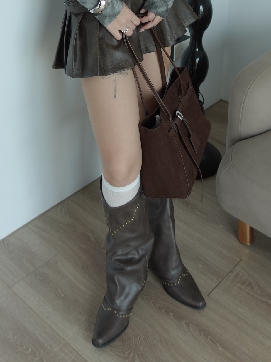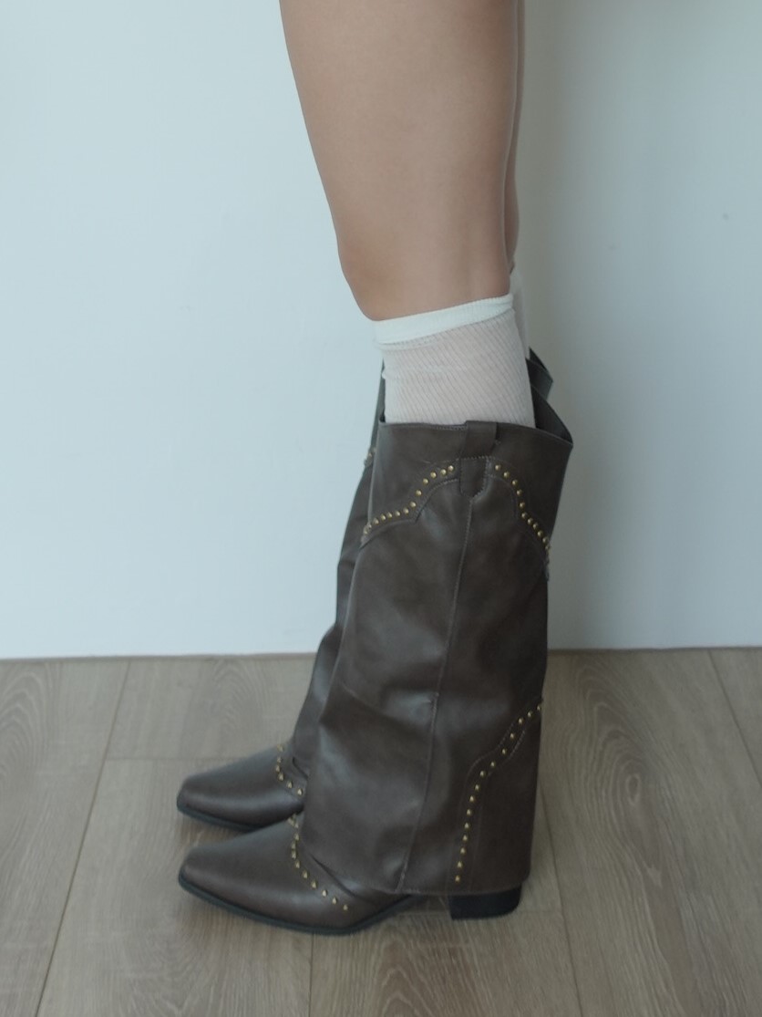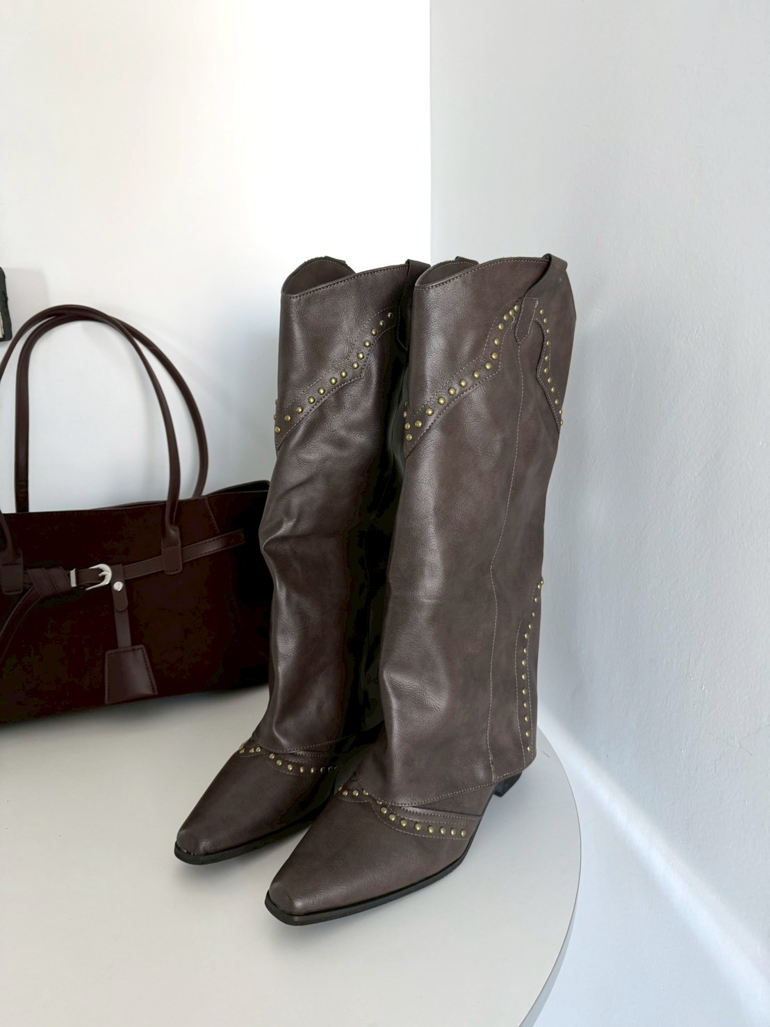 金屬鉚釘細節低調點綴,讓整雙靴子在溫潤輪廓中