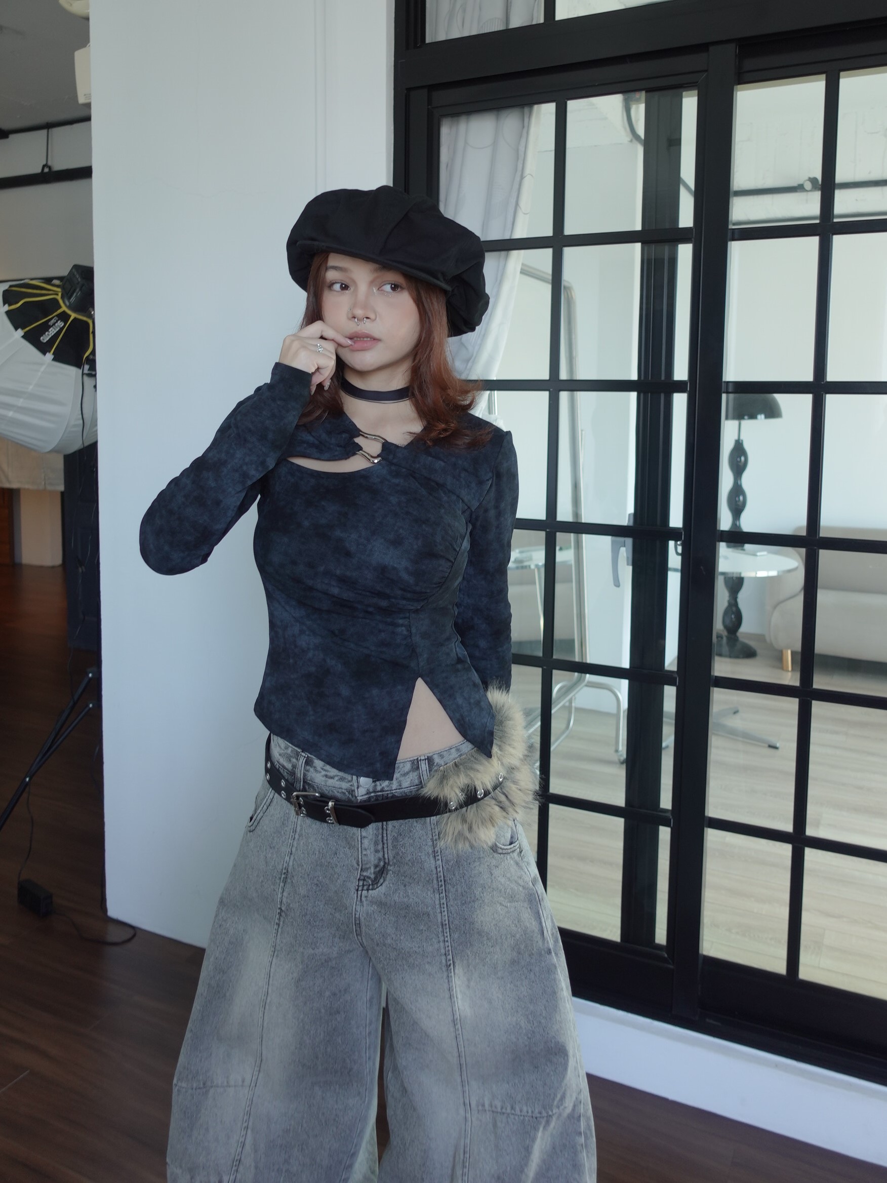 方領拉鍊釦帶上衣