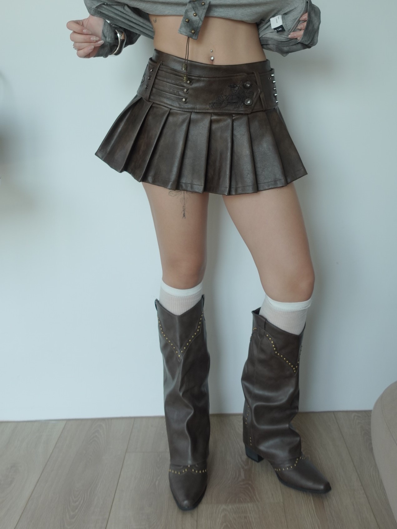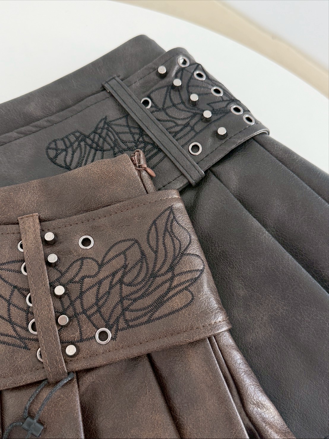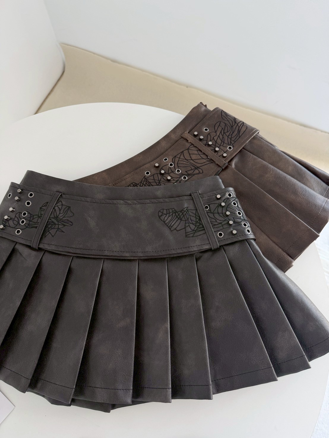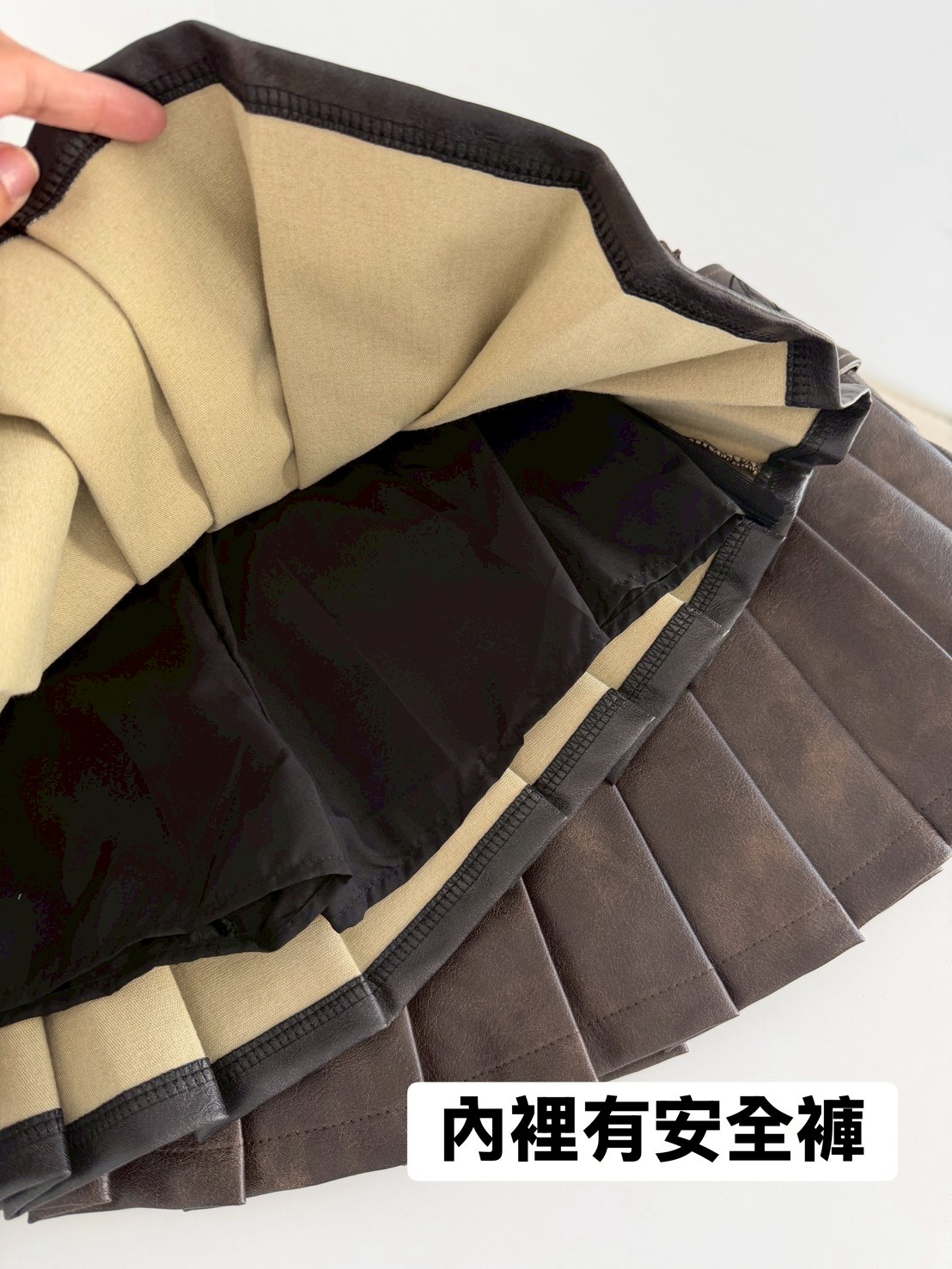 霧感皮革搭配立體百褶剪裁,讓短裙在俐落中多了一點份量感,內裡有附安全褲,側面有隱形拉鍊!搭配可拆式腰封和腰頭設計結合金屬釘釦與細節壓線,自然拉出腰線,也讓整體造型更有完成度,細節度超高級的一款,皮面的質感也超級棒~